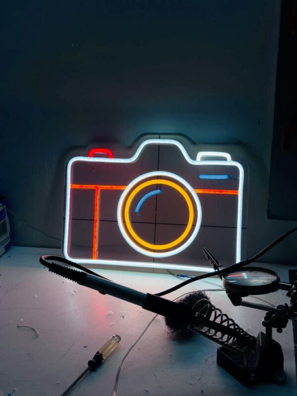 تابلو از جنس پلکسی و متریال مقاوم با خطوط نئونی رنگی ساخته شده است. طرح دوربین عکاسی بهصورت ظریف و جذاب روی آن اجرا شده و جلوهای مدرن به دیوار میبخشد.