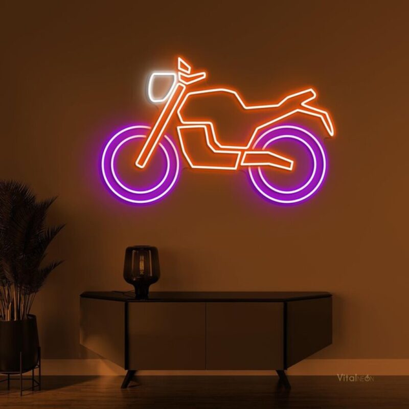 ساختهشده از پلکسی براق شفاف و مشکی، طراحی خطی موتورسیکلت با نئونهای رنگی نارنجی، بنفش و سفید، ابعاد استاندارد برای نصب روی دیوار، سبک و مقاوم.