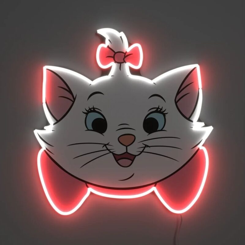 این تابلو از پلکسی شفاف با چاپ فلتبد رنگی و خطوط دورگیریشده با نئون فلکس قرمز و سفید ساخته شده است. طرح چهره گربه بانمک با پاپیون قرمز و چشمهای بزرگ، روی پلکسی با کیفیت بالا چاپ شده و نور نئون جلوهای خاص و سهبعدی به تابلو بخشیده است.