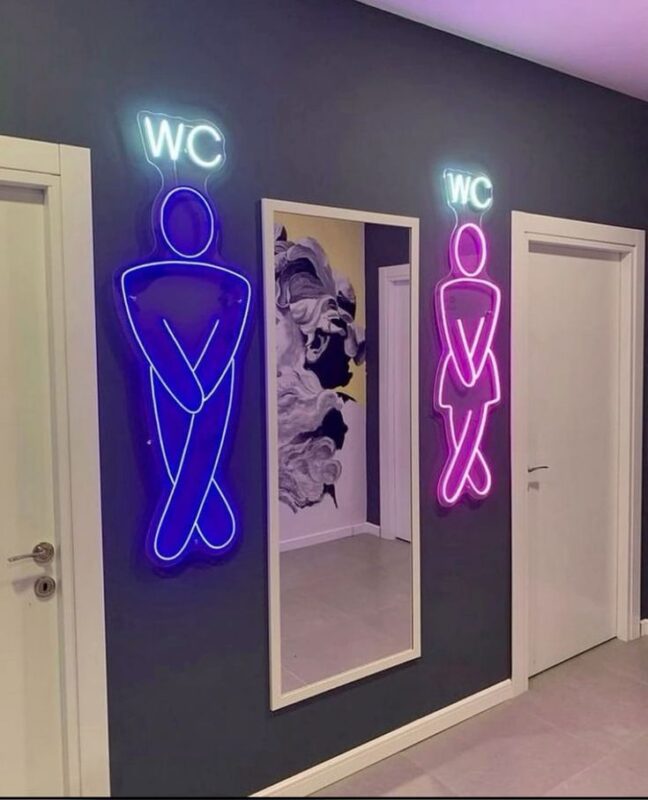 این تابلو از ترکیب متریال پلکسی با ضخامت ۳ میلیمتر و نئون فلکس باکیفیت ساخته شده است. نورهای نئون رنگی جذاب و طراحی واضح زنانه و مردانه، این محصول را برای محیطهای شلوغ و مدرن بسیار مناسب کرده است.