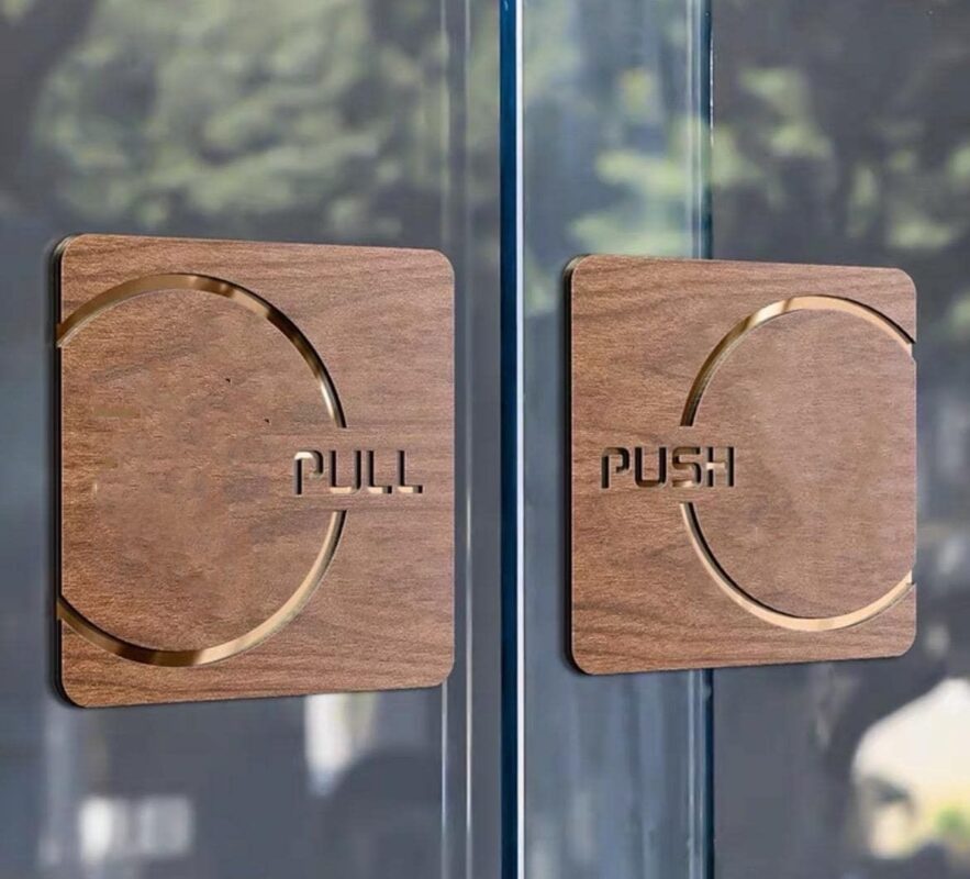 یک جفت پلاک مربع با گوشههای گرد، ساختهشده از MDF و پلکسی، دارای خطوط هلالی و نوشتههای لیزرکات PUSH و PULL. ترکیب بافت طبیعی چوب و براقیت پلکسی باعث ایجاد جلوهای خاص روی شیشه شده و به محیط روح میبخشد.