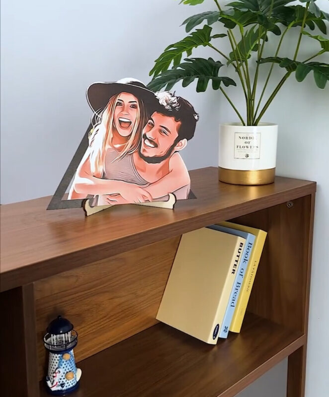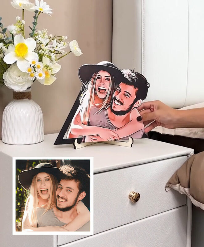 طرح نهایی بهصورت دقیق دوربری میشه و به شکل یک استند خاص در میاد که روی میز، شلف یا میز آرایش بهراحتی قرار میگیره. این تابلو نه قاب داره، نه شکل تکراری! کاملاً منحصربهفرد و متناسب با عکس شما ساخته میشه. ترکیب چهره کارتونی با متریال طبیعی چوب، یه حس گرم، صمیمی و دوستداشتنی به فضا میده 🧡