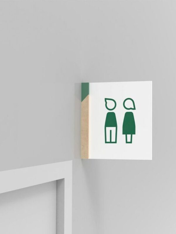 صفحه پلکسی سفید با ضخامت ۳ میلیمتر که روی آن نماد زن و مرد به رنگ سبز قرار دارد. کنارهی تابلو از چوب طبیعی با رنگ گرم ساخته شده و کل مجموعه بهصورت زاویهدار روی دیوار نصب میشود تا از دو طرف قابل مشاهده باشد.