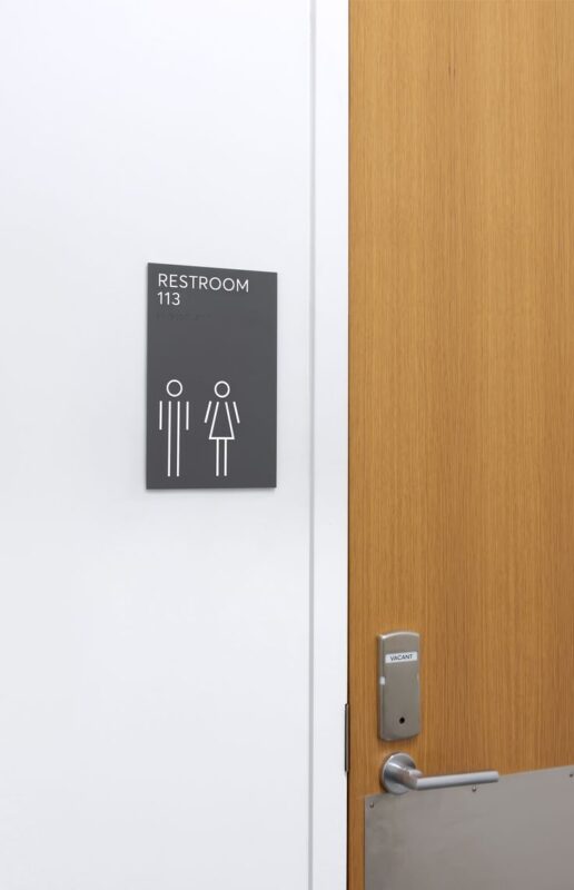 طراحی مینیمال با دو آیکون ساده مرد و زن، حس نظم و مدرنیته را به فضا منتقل میکنه. نوشتهی “RESTROOM 113” بهصورت واضح و با فونت رسمی روی زمینه مشکی درج شده و بهراحتی از فاصله دور قابل شناساییه. این ترکیب باعث شده تا هم کاربرپسند باشه و هم برای محیطهایی با طراحی مدرن کاملاً مناسب باشه.