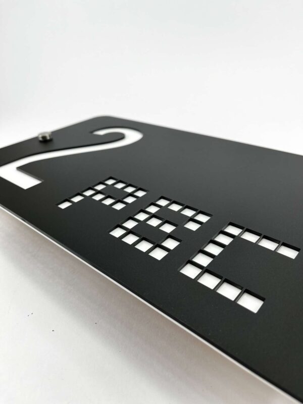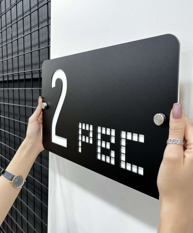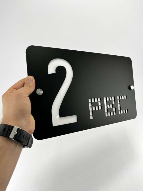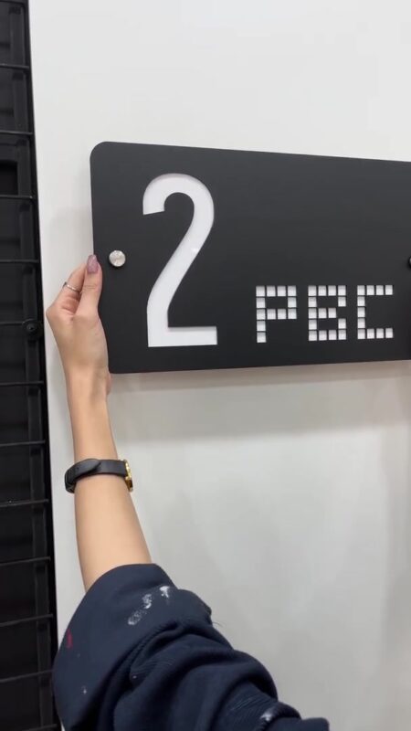عدد بزرگ و واضح “2” در سمت چپ تابلو قرار دارد و زیر آن عبارت “PBC” با فونت پیکسلی مدرن و با تکنیک برش لیزری طراحی شده که بهزیبایی نور یا رنگ پشت زمینه را نشان میدهد. این نوع طراحی نهتنها زیبایی بصری دارد، بلکه در فضاهای نیمهروشن یا دارای نور پسزمینه، خوانایی بالایی خواهد داشت.
