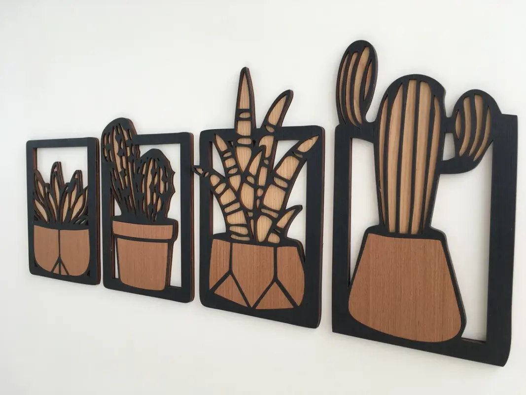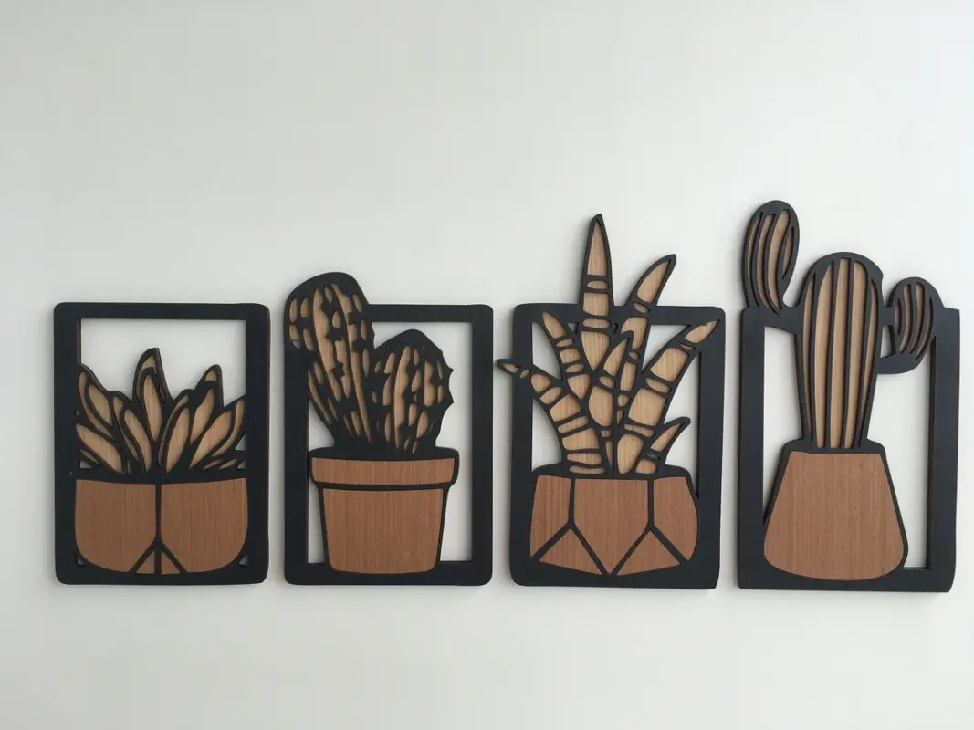 این تابلوها به صورت چندتکه طراحی شدهاند که هرکدام گلدانی از گیاهان را به شکلی هنری به تصویر کشیده است. لایهبندی هوشمندانه چوب و MDF، عمق و جذابیت بیشتری به طرحها داده و ترکیب رنگ گرم چوب با مشکی MDF، هماهنگی چشمگیری ایجاد کرده است. ✨