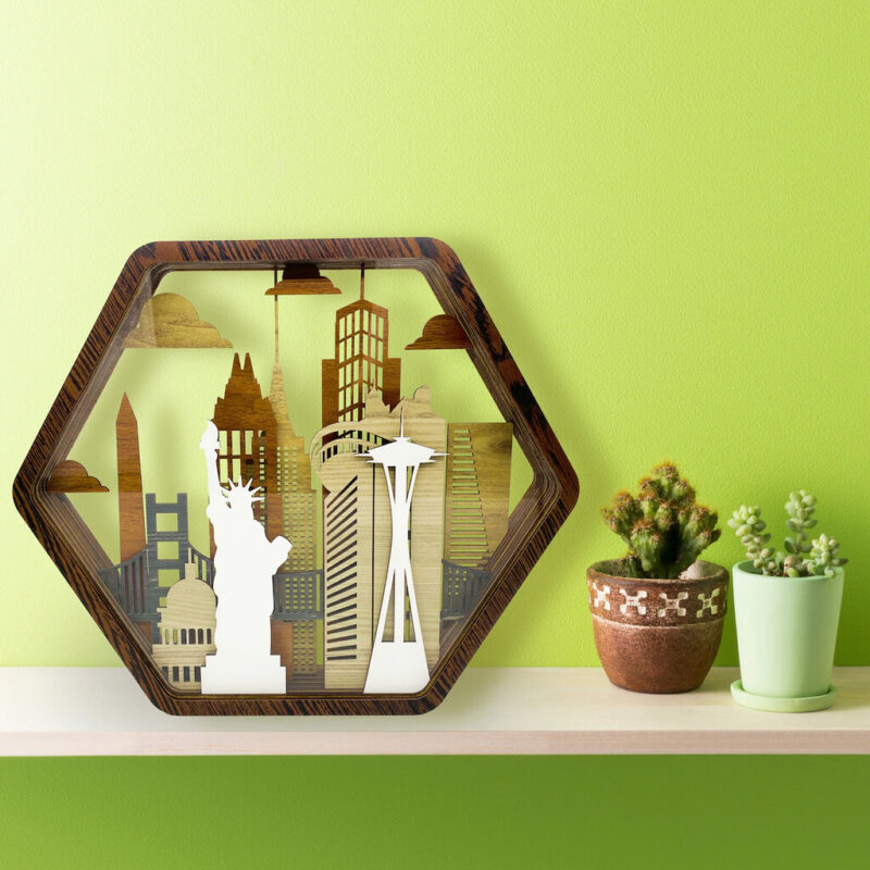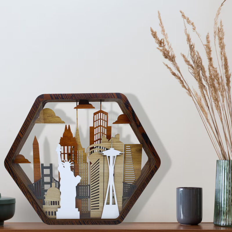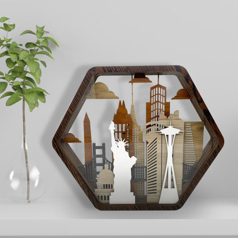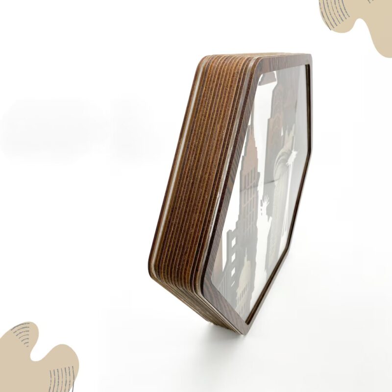 بدنه اصلی این اثر از MDF با ضخامت ۳ میلیمتر ساخته شده و برای لایههای جلوهدهنده از پلکسی استفاده شده که درخشش و عمق بیشتری به صحنه میده. ترکیب رنگهای چوب طبیعی، رنگآمیزی خاص و برش دقیق لیزری باعث شده تا این دکوری، یک المان فوقالعاده جذاب برای دکوراسیون مدرن، صنعتی یا مینیمال باشه.