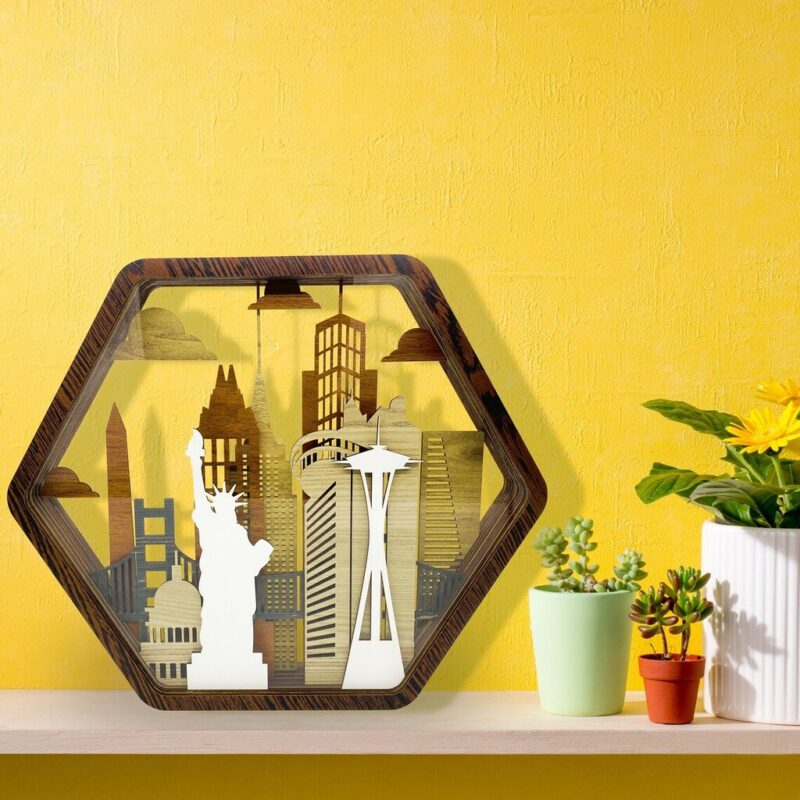 تابلو دارای قاب ششضلعی زیباست که بیش از ۱۶ لایه چوب و پلکسی داخلش قرار گرفته. طراحی سهبعدی، رنگهای طبیعی و شفافیت پلکسی جلوهای بسیار چشمگیر ایجاد میکنه. مناسب برای استفاده ایستاده روی میز یا قفسه دکوری.