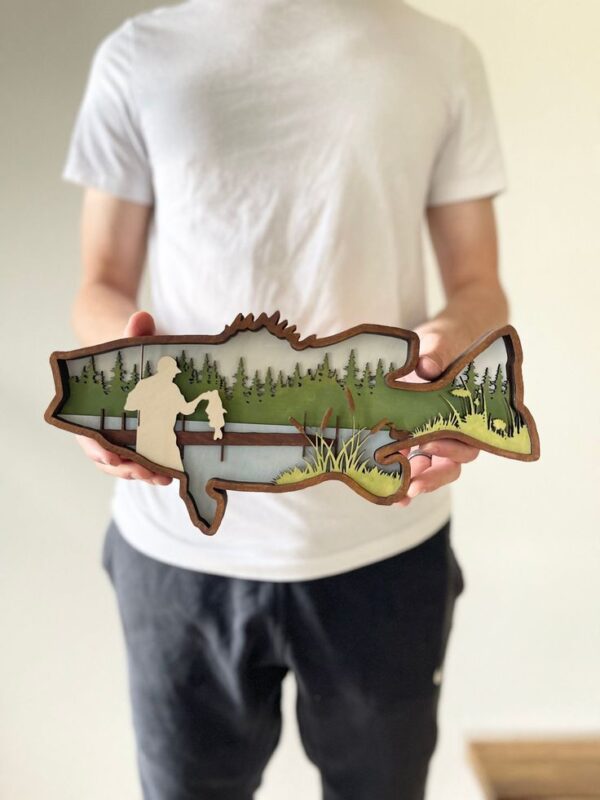 این تابلو از چند لایه چوب سهلایه ۳ میلیمتری ساخته شده که با برش لیزری دقیق و رنگآمیزی دستی، عمق و بُعدی خاص به طرح داده. طراحی خاص و متفاوت بدنه که شبیه نقشه یا حتی فرم ماهی است، به محصول هویتی منحصربهفرد بخشیده. این اثر هنری برای هدیه به پدرها، عاشقان طبیعت یا حتی علاقهمندان به ماهیگیری یک انتخاب خاص و خاطرهانگیز است 🎁🪵