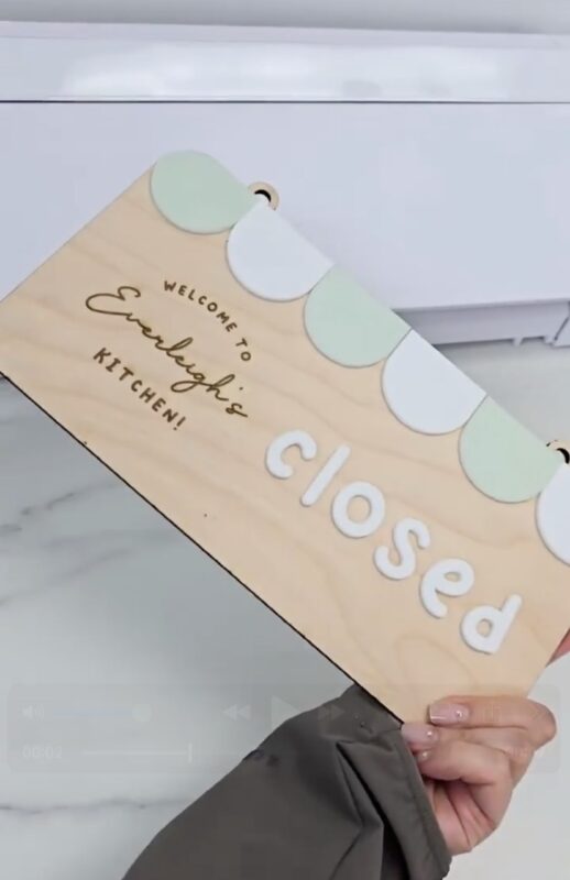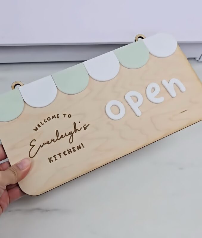 حروف برجسته “open” یا “close” از پلکسی سفید و با ظرافت خاصی روی چوب نصب شدهاند و قسمت بالای تابلو با طرح نیمدایرههای رنگی، حس یک فروشگاه دوستداشتنی و گرم را به مشتری منتقل میکند. متن خوشآمدگویی نیز با حکاکی دقیق روی چوب نوشته شده که ترکیب بصری دلنشینی ایجاد میکند. شما میتوانید این تابلو را دوطرفه طراحی کنید تا در یک سمت حالت باز و در سمت دیگر حالت بسته را نمایش دهد 🪧.