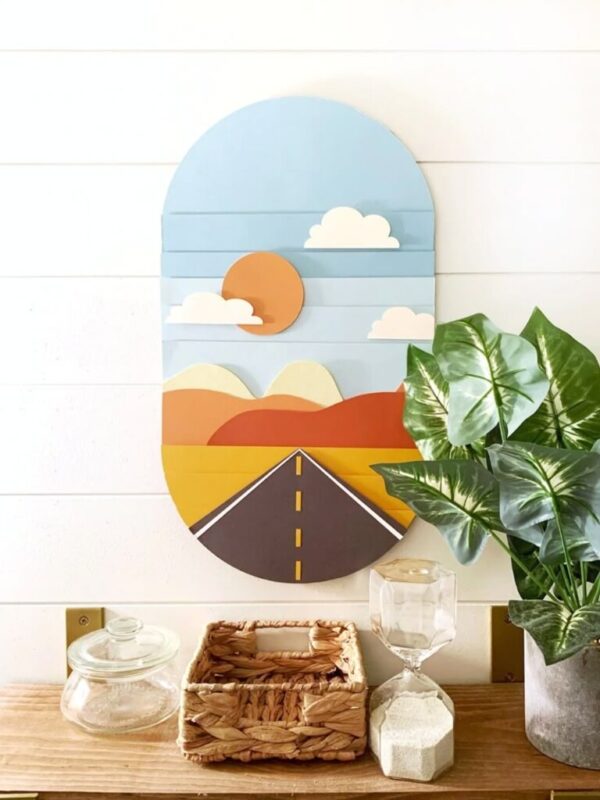 این تابلو از چند لایه چوب سهلایه تشکیل شده و با رنگآمیزی دستی و چاپ جزئیات کامل صحنه غروب و جاده طراحی شده است. فرم بیضیشکل آن جلوهای مدرن و متفاوت به اثر داده است.