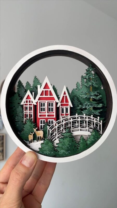 تابلو بهصورت دایرهای طراحی شده و درون آن نمایی از یک خانه کلاسیک قرمز در دل درختان کاج، پل چوبی سفید و دو گوزن در فضای زمستانی دیده میشود. تمامی اجزا با دقت بالا از چوب سهلایه بریده و با رنگهای طبیعی و زیبا رنگآمیزی شدهاند.