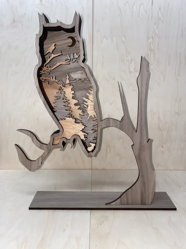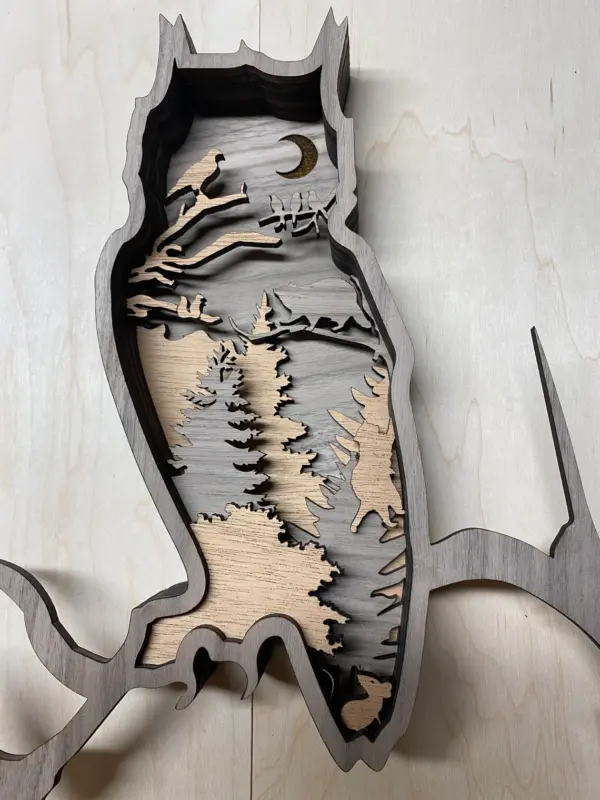 این اثر هنری با استفاده از **چوب سهلایه با ضخامت ۳ میلیمتر** در چندین لایه طراحی شده که با تکنیک برش لیزری دقیق و **رنگآمیزی دستی** ساخته شده. تصویر یک جغد که روی شاخه نشسته و درون آن چشماندازی از جنگل، حیوانات، پرندگان و ماه نیمهشب دیده میشود، بهصورت چندبُعدی و برجسته اجرا شده که حس عمق، زندگی و آرامش طبیعت را منتقل میکند 🌲✨