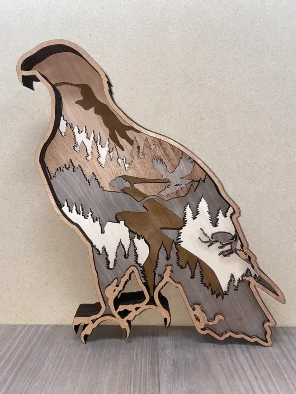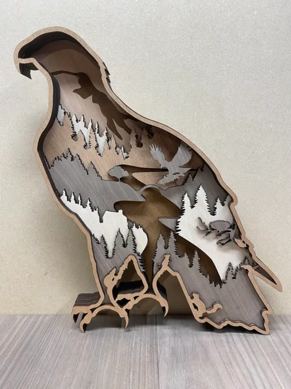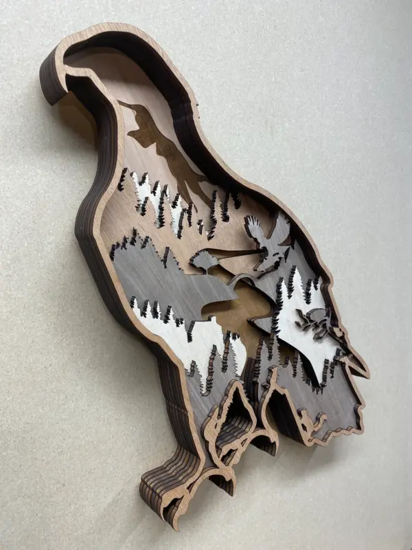 این تابلو با استفاده از **چوب سهلایه با ضخامت ۳ میلیمتر** ساخته شده و در چندین لایه با برش لیزری بسیار دقیق شکل گرفته. درون بدن عقاب، منظرهای از جنگل، درختان، رودخانه و حیوانات وحشی با رنگآمیزی دستی دیده میشه که عمق و روحی متفاوت به کار میده. هر لایه با رنگ چوب متفاوت و با جزئیات بالا، فضایی سهبعدی، زنده و چشمنواز خلق کرده 🎨