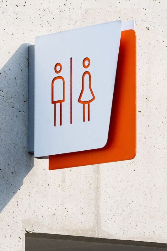 در ساخت این تابلو از دو متریال باکیفیت یعنی پلکسیگلاس ۳ میلیمتر و PVC با رنگ نارنجی استفاده شده است. سطح سفید رنگ با برش دقیق لیزری، نماد مرد و زن را به صورت توخالی نمایش میدهد و لایهی نارنجی زیرین با ایجاد کنتراست رنگی، این نمادها را کاملاً برجسته و خوانا میسازد. همین طراحی ساده اما هوشمندانه باعث میشود تابلو از فاصلهی دور نیز به خوبی قابل تشخیص باشد.