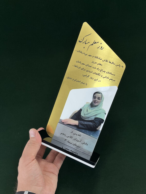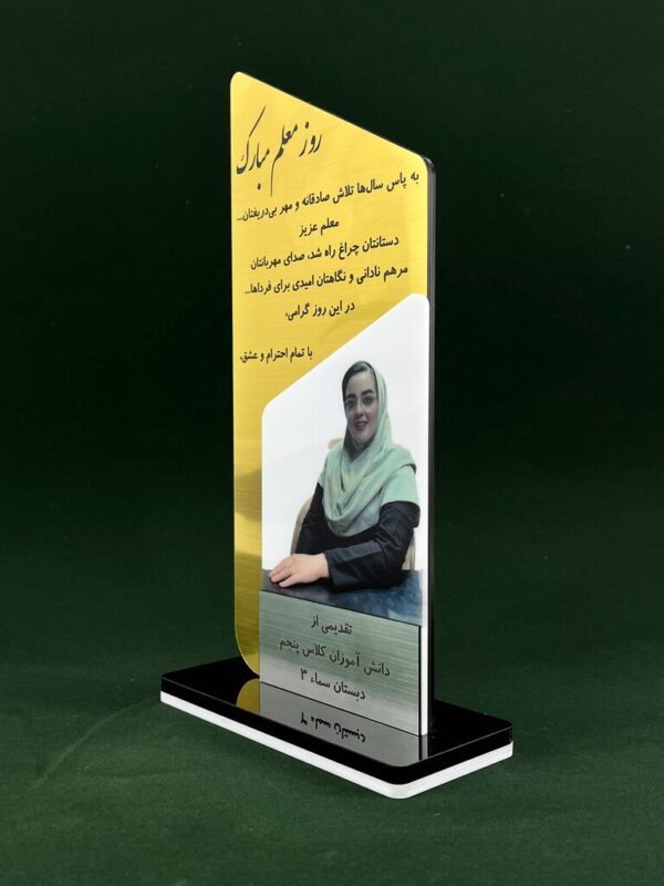 این تندیس از پلکسی شفاف 3 میلیمتری ساخته شده که دارای پایه مستحکم مشکی با لایه سفید برای زیبایی بیشتر است. طرح طلایی و چاپ عکس معلم به صورت کاملاً حرفهای و صاف روی سطح محصول اجرا شده است. فرم گوشههای گرد و زاویهدار نیز زیبایی آن را دوچندان کرده است.