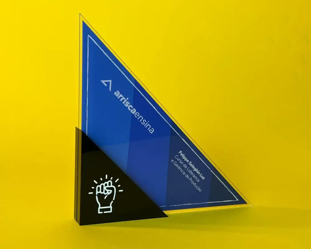 ساختار مثلثی این تندیس، همراه با پایه مشکی مات و جزئیات گرافیکی حکاکیشده، حس قدرت، نوآوری و پایداری را منتقل میکند. ترکیب رنگهای شفاف و مشکی باعث شده این محصول هم در فضاهای رسمی و هم در محیطهای خلاقانه، بدرخشد. 🌟
