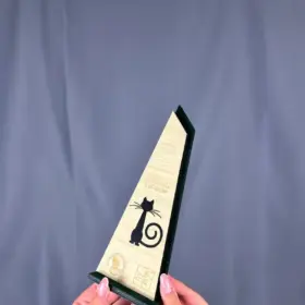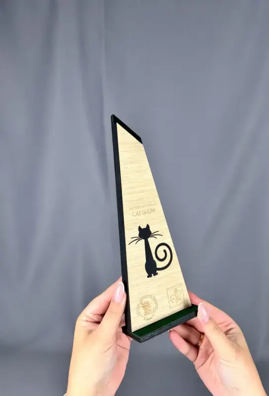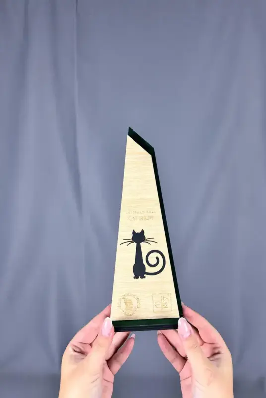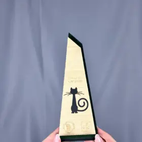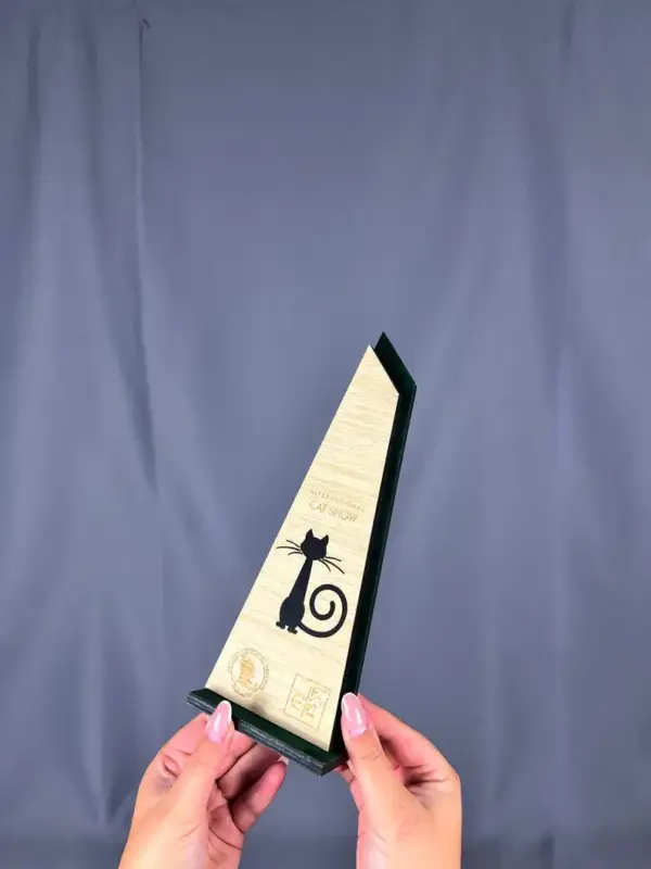 تندیس دارای طراحی مینیمالیستی با طرح گربه است که بر روی چوب سه لایه حک شده و در پایهای مشکی قرار گرفته است. استفاده از ال ای دی به آن جلوهای خاص و مدرن بخشیده است.