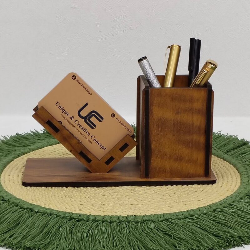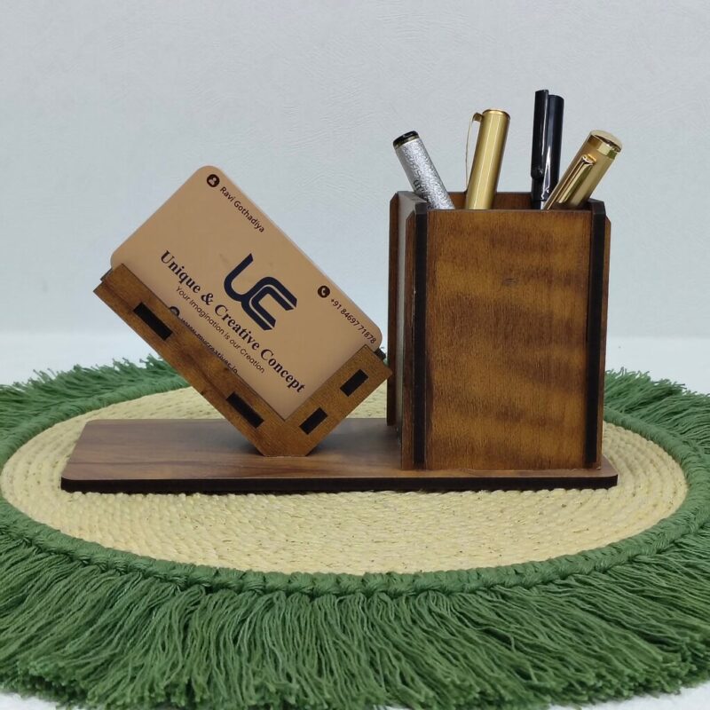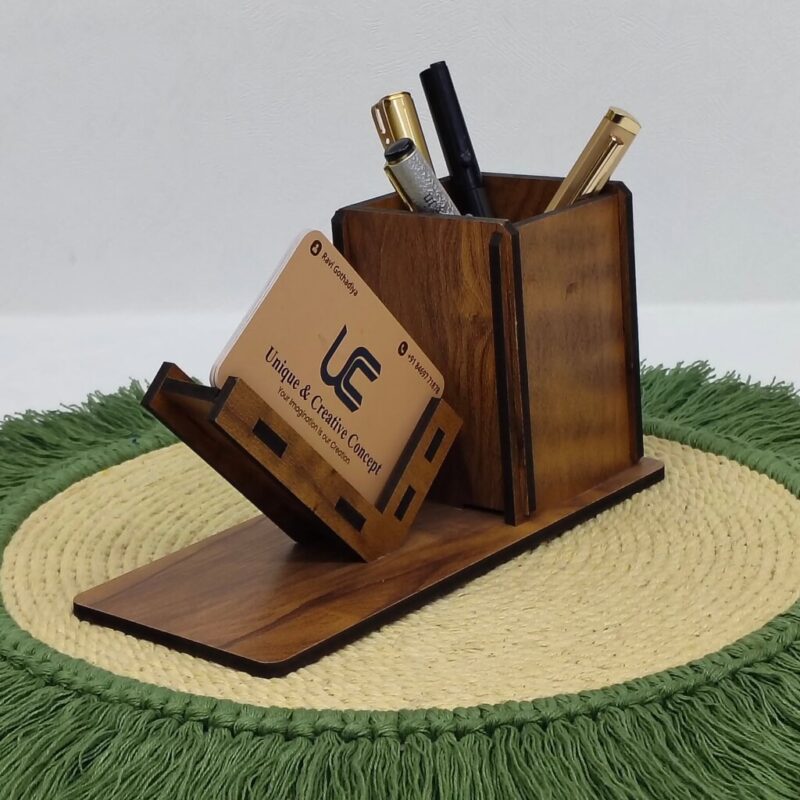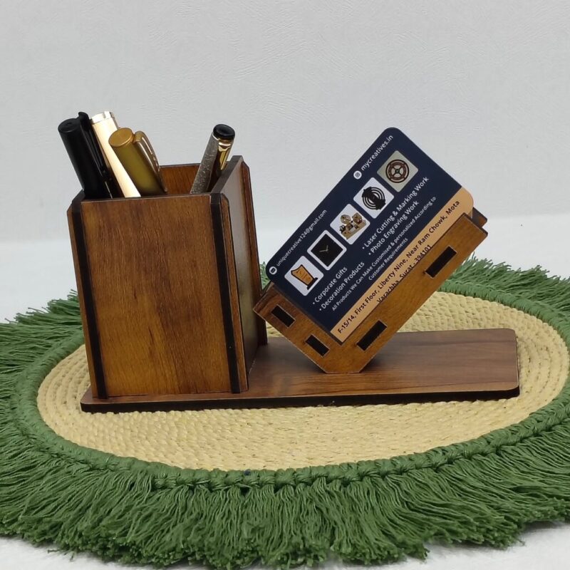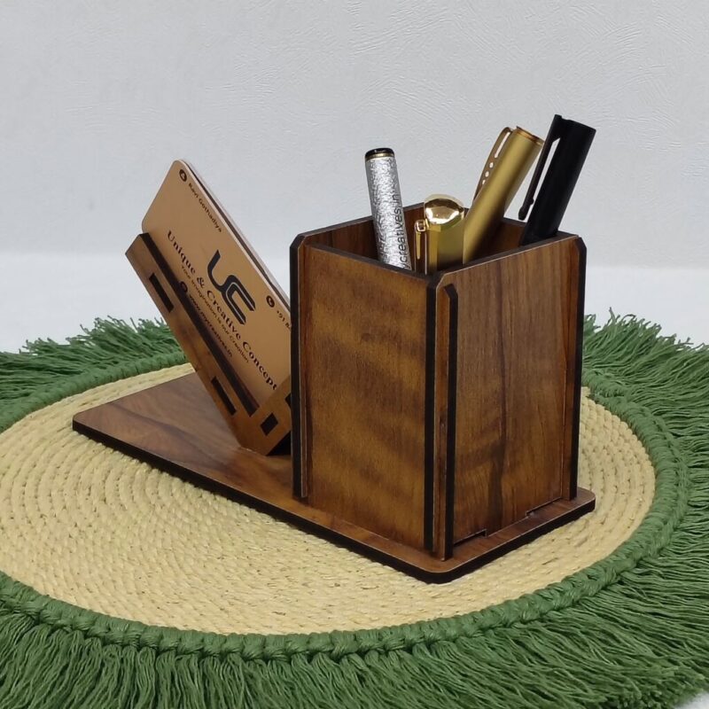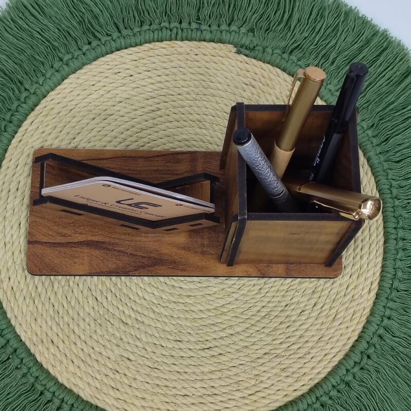 ساختهشده از MDF با ضخامت ۳ میلیمتر، با پرداخت رنگ طبیعی چوب. دارای پایه مستطیلی، محفظه مربعی برای نوشتافزار و یک نگهدارنده زاویهدار کارت ویزیت. طراحی مینیمال، بدون پیچیدگی و کاملاً کاربردی.