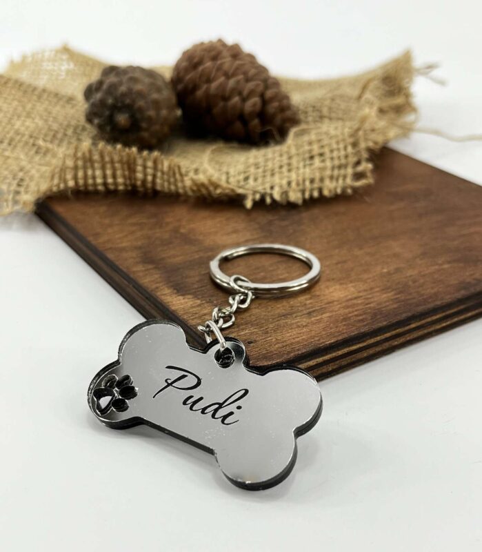 طراحی این تگ به شکل استخوان با لبههای گرد انجام شده. بدنهی پلکسی آینهای نقرهای روی زمینه مشکی برجسته قرار گرفته و اسم پت با فونت زیبا و خوانا حکاکی شده است. یک سمبُل ردپای حیوان نیز کنار اسم قرار گرفته که حس حیواندوستی را تقویت میکند.