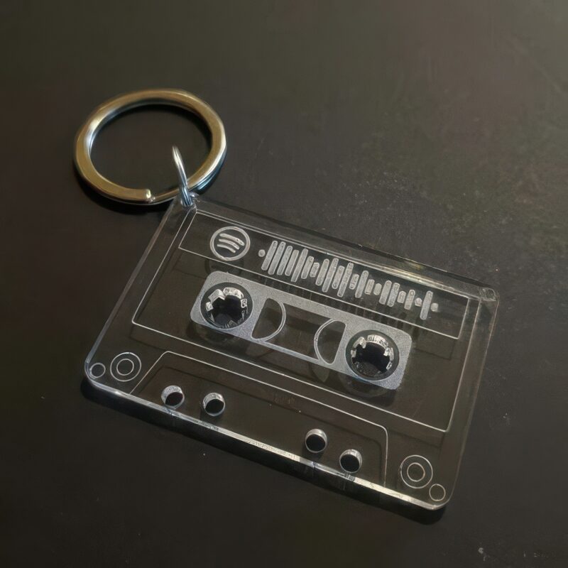 این محصول از پلکسی شفاف با ضخامت ۳ میلیمتر ساخته شده و با استفاده از برش و حکاکی لیزری، جزئیاتی دقیق و چشمنواز روی آن ایجاد شده است. نکته جذاب این جاکلیدی این است که میتوانید **بارکد اسپاتیفای** آهنگ موردعلاقه خود را روی آن حکاکی کنید تا تنها با اسکن آن، موسیقی محبوبتان را به راحتی پخش کنید! 🎵📲