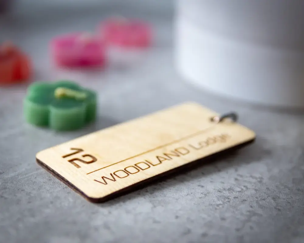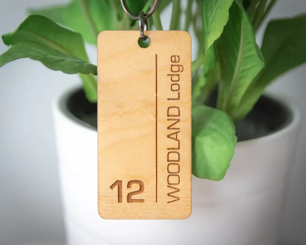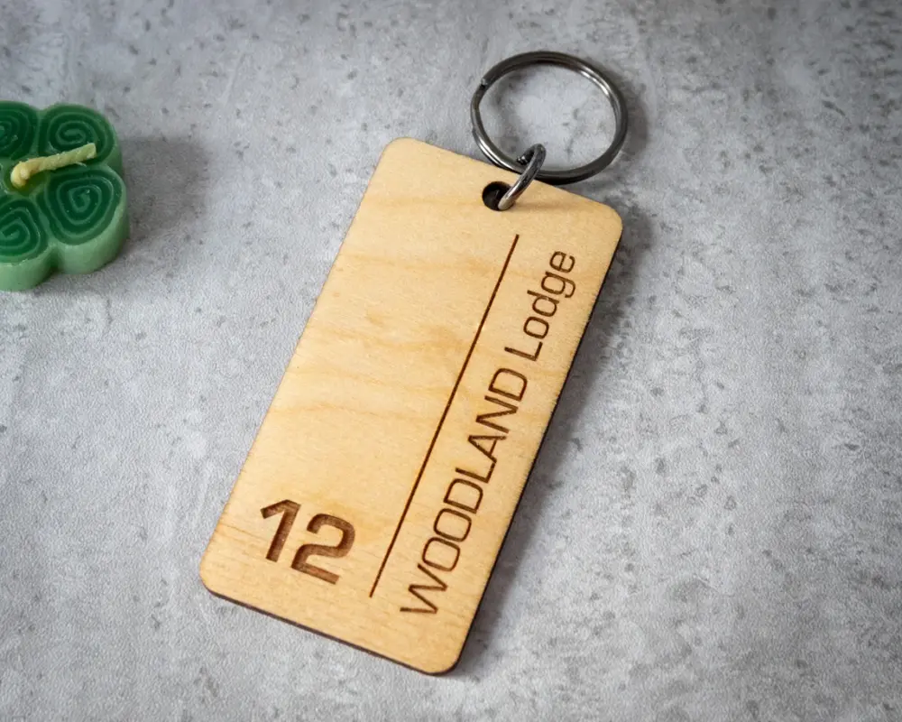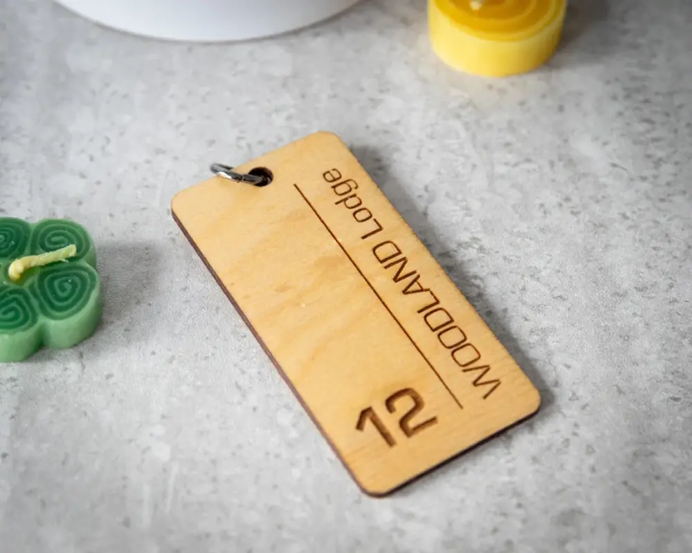 بدنه این جاکلیدی از چوب سهلایه با ضخامت ۳ میلیمتر ساخته شده که سبک، مقاوم و بسیار خوشدست هست. حکاکی شماره اتاق و عنوان دلخواه (مثل نام مجموعه یا برند) با دقت لیزری روی چوب انجام میشه و جلوهای ماندگار و خاص ایجاد میکنه.