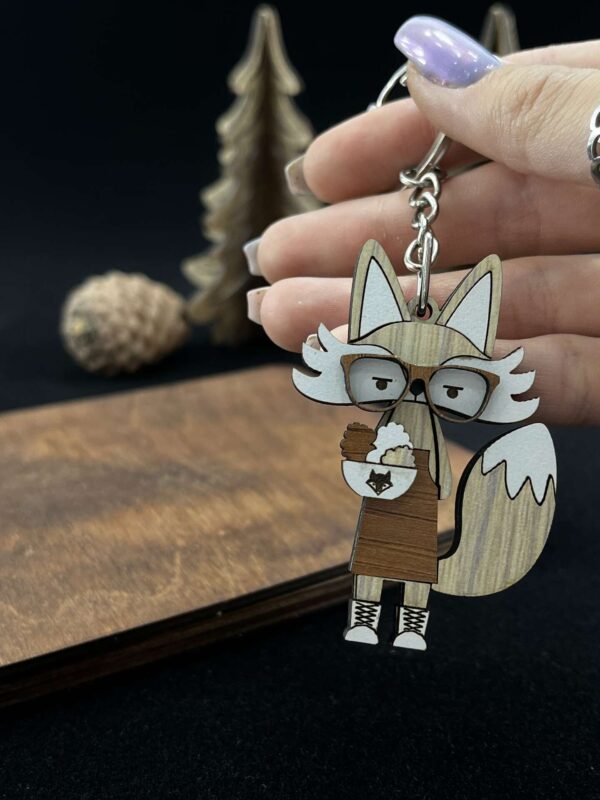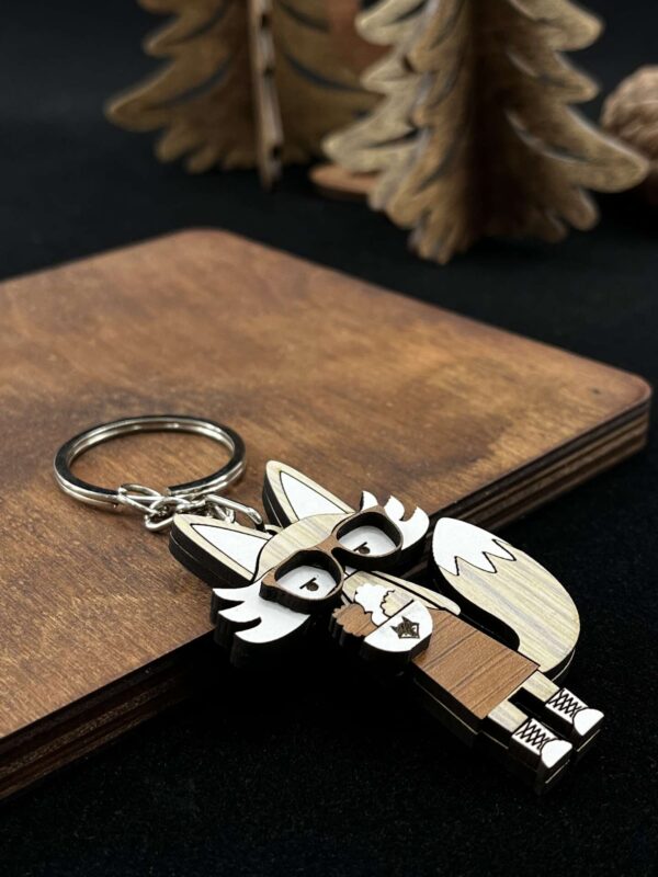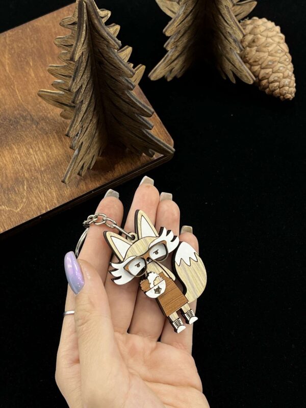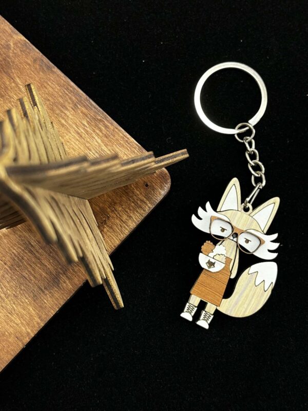 ساختهشده از ام دی اف با ضخامت ۳ میلیمتر، طراحی چندلایه با حکاکی و رنگآمیزی دقیق. شخصیت روباه با عینک، لباس و ظرف بستنی طراحی شده و حلقهی فلزی مقاوم برای اتصال دارد.