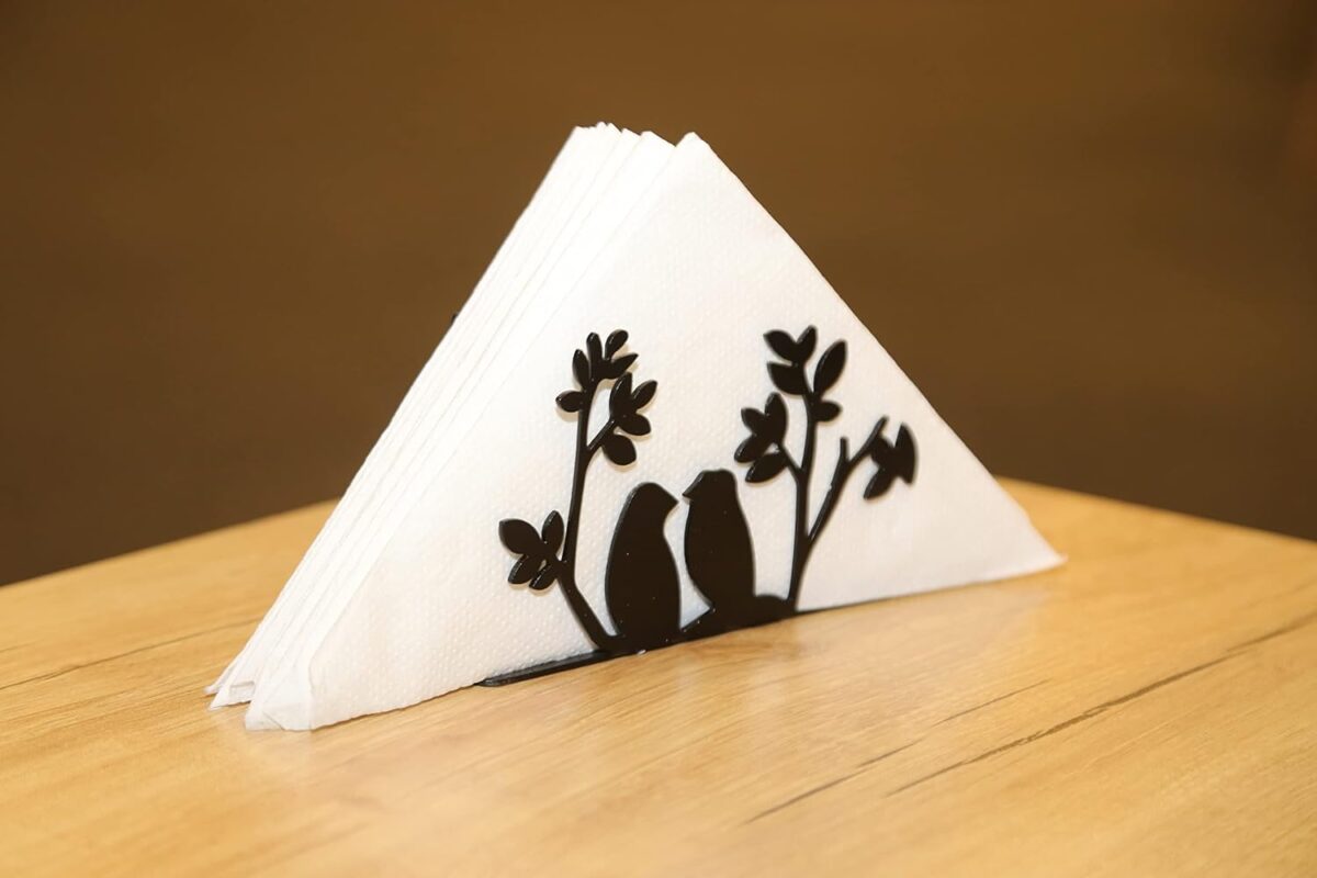 ساختهشده از پلکسی گلاس مشکی با ضخامت ۳ میلیمتر، این محصول هم سبک و مقاومه، هم ضدآب و با دوام. طراحی ظریف و برش لیزری دقیق باعث شده فرم برگها، شاخهها و پرندهها به زیبایی کامل دیده بشن – مخصوصاً وقتی با دستمالهای سفید یا رنگ روشن ترکیب بشه ✨