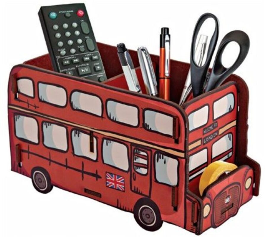 این جای لوازم تحریر به شکل اتوبوس دوطبقه طراحی شده و با رنگ قرمز و چاپ گرافیکی جزئیات، بسیار شبیه نسخه کلاسیک لندن است. از MDF با ضخامت ۳ میلیمتر ساخته شده و شامل چندین بخش برای نگهداری انواع لوازم اداری و تحریری است. ظاهر فانتزی و کودکپسند آن، مناسب برای دکور میزهای خاص است.