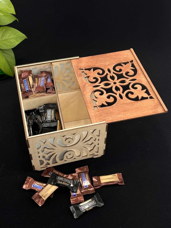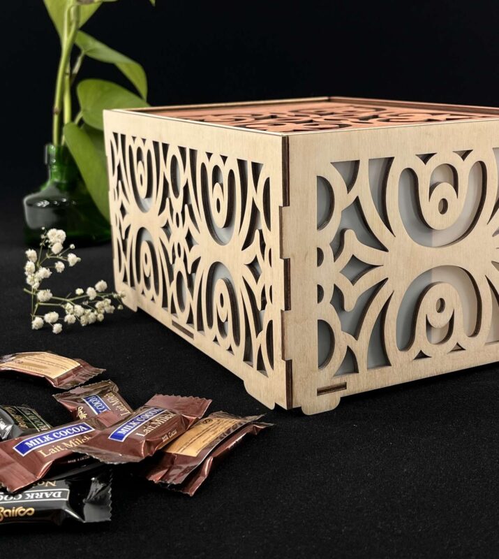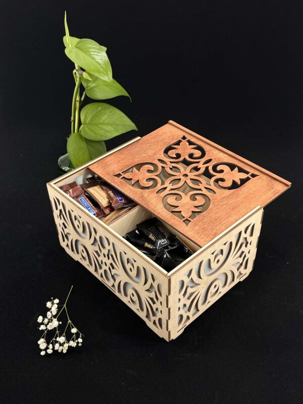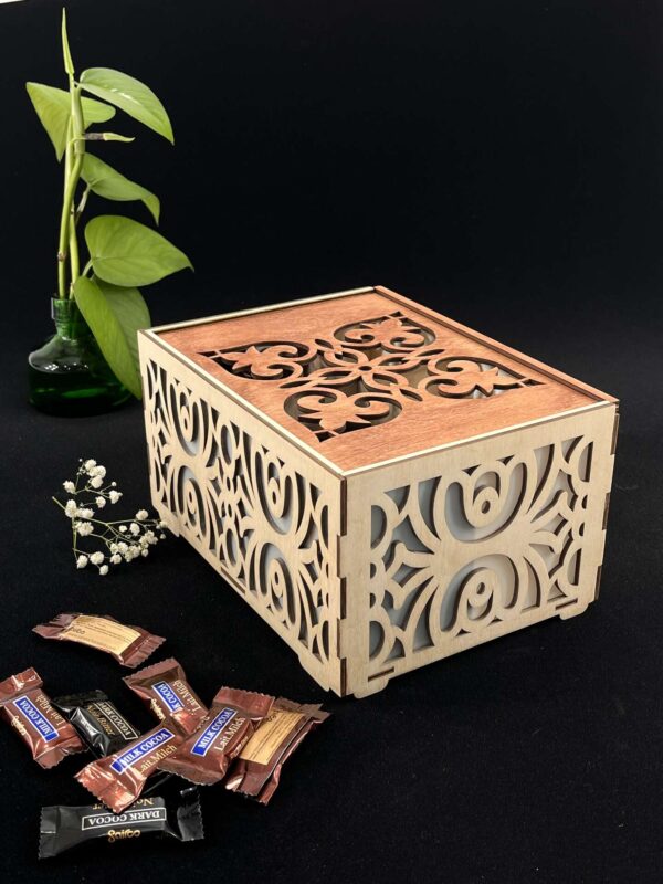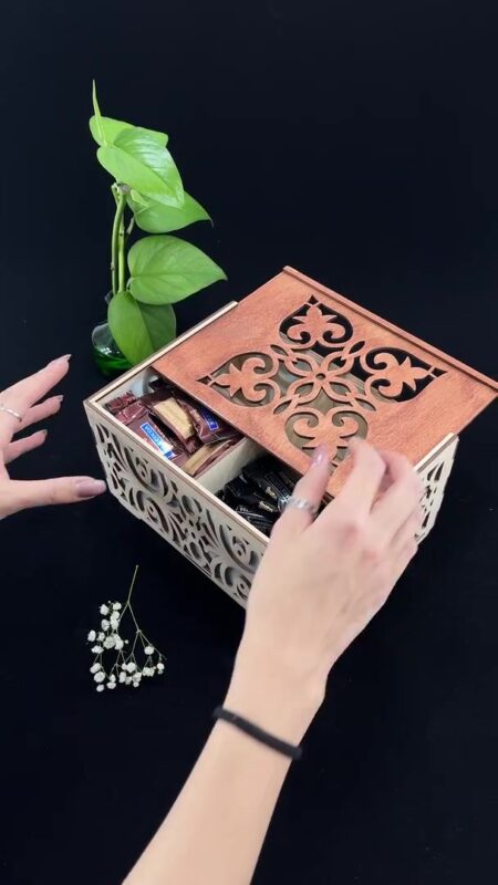 جعبه هم از نظر وزنی سبکه و هم به خاطر استفاده از برش لیزری، ظرافت خیلی خوبی داره. علاوه بر اون، بهراحتی میتونی داخلش رو با خوراکیهای دلخواه پر کنی و برای مناسبتهای خاص استفادهش کنی.