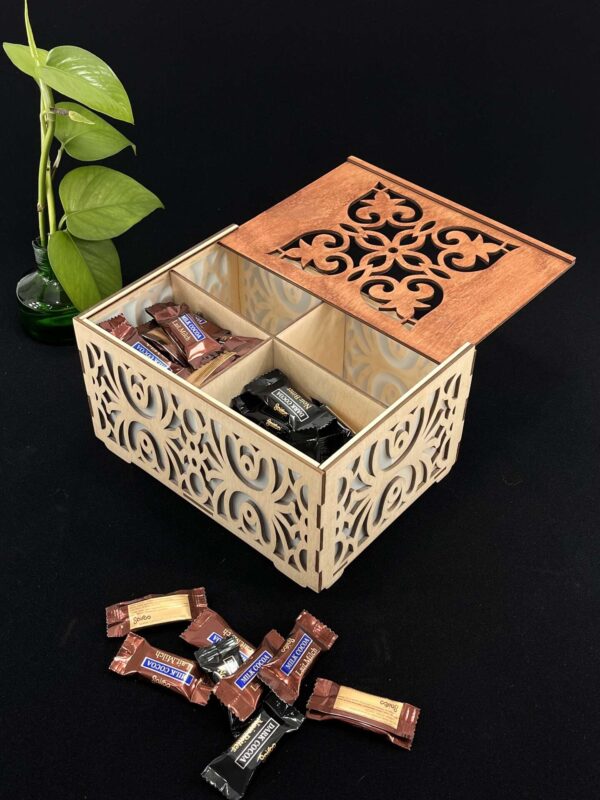این جعبه دارای چند قسمت جداگانهست که برای نگهداری انواع شکلات، آجیل، قهوه یا حتی دمنوش خیلی کاربردیه. توی مهمونیها یا حتی روی میز کاری، کلی به نظم و شیک بودن فضا کمک میکنه. اگه دنبال یه هدیه متفاوت و کاربردی هم باشی، انتخاب خیلی مناسبیه! 🎁