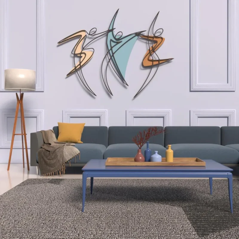 این دکور از **چوب سهلایه روسی ۳ میلیمتری** ساخته شده و با دقت برش خورده است. طراحی آن شامل حرکات انتزاعی رقصندهها است که با خطوطی روان و مدرن ترکیب شده تا جلوهای **حجمی و سهبعدی** به دیوار ببخشد. رنگبندی چوب و ترکیب فرمهای منحنی، این دکور را به **اثری هنری و خاص** تبدیل کرده است.