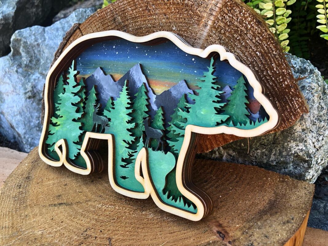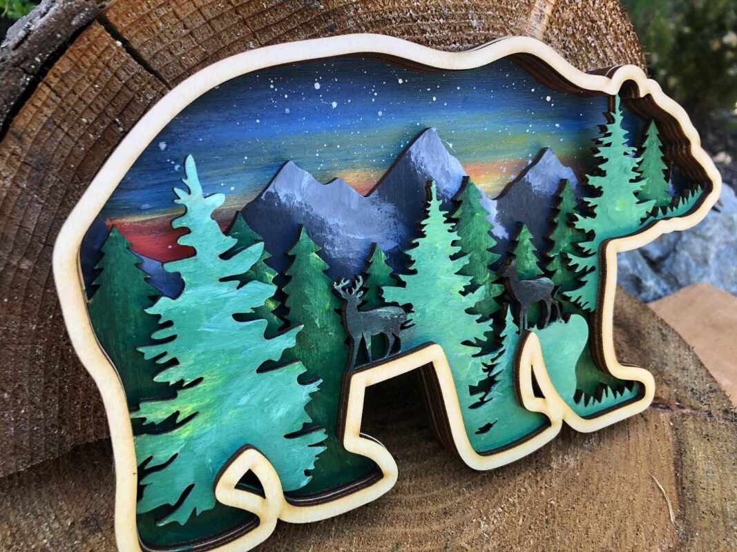 طرح خرس بهصورت توخالی و لایهلایه طراحی شده و داخل آن منظرهای از کوه، درخت و آسمان شب به زیبایی قرار گرفته است. لایهها با دقت بالا از چوب MDF سهلایه ساخته شدهاند و با رنگهای گرم و سرد ترکیب شدهاند تا تصویری عمیق و هنری خلق شود.