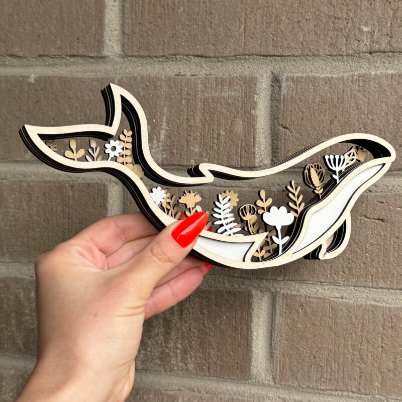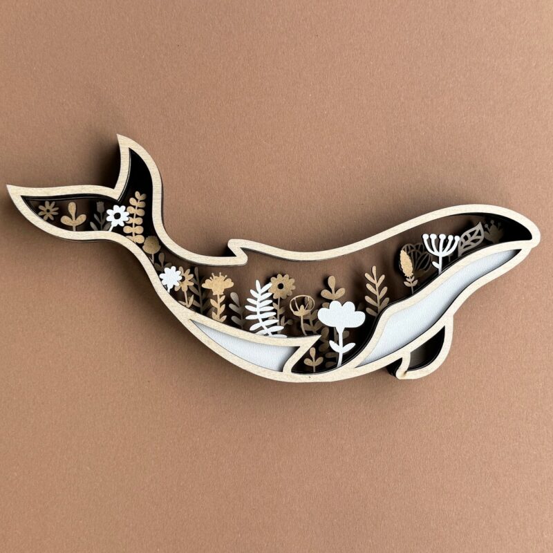 بدنه این نهنگ زیبا از چندین لایه چوب سهلایه با ضخامت ۳ میلیمتر ساخته شده که هر لایه، بهشکل دقیق با برش لیزری آماده شده و با رنگهای طبیعی و سفید رنگآمیزی شده تا تضاد چشمنوازی بین چوب و گلها ایجاد بشه. طراحی داخل نهنگ شامل گلها، برگها و گیاهان فانتزیه که نشوندهندهی تلفیق آرامش دریا با سرزندگی طبیعته 🌿