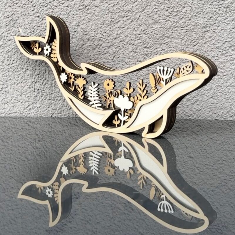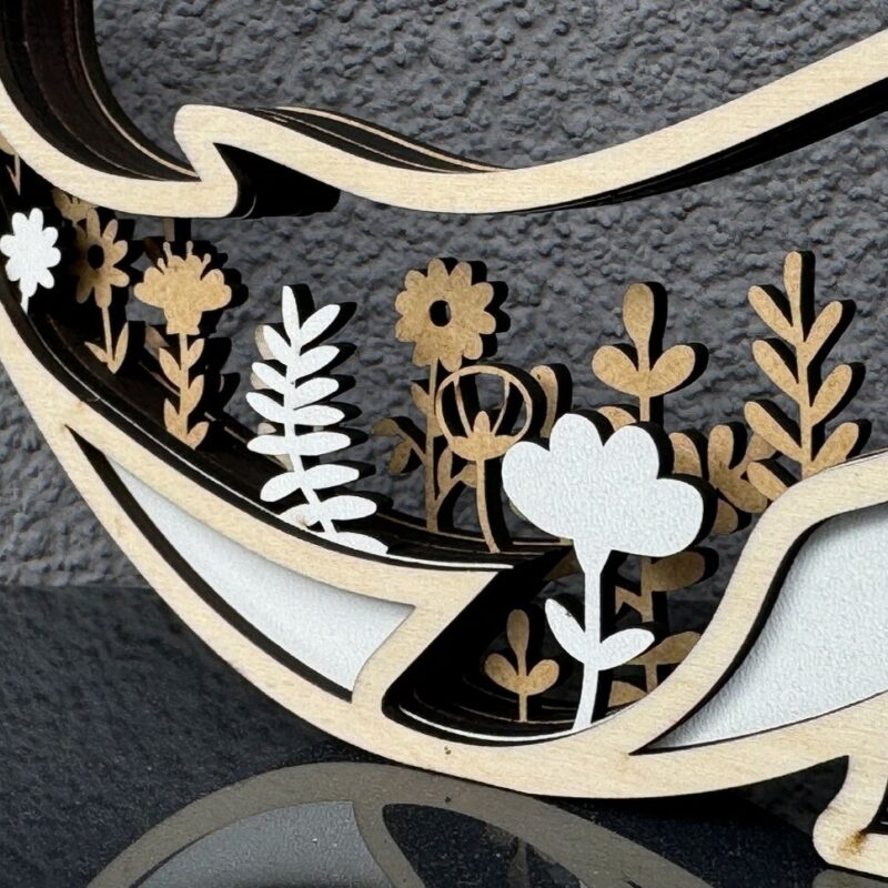 دکور بهصورت یک نهنگ فانتزی طراحی شده که داخل بدن آن گلهای متنوع با رنگهای طبیعی و سفید دیده میشوند. این اثر از چند لایه چوب سهلایه ساخته شده که با رنگآمیزی دستی و برش دقیق لیزری جلوهای خاص به آن داده شده است.