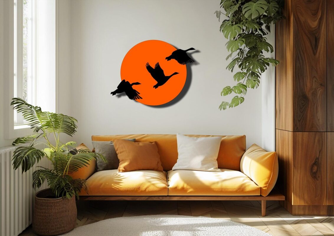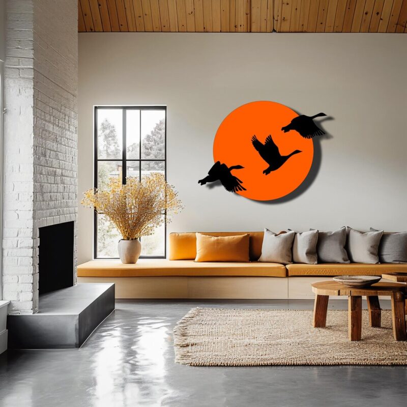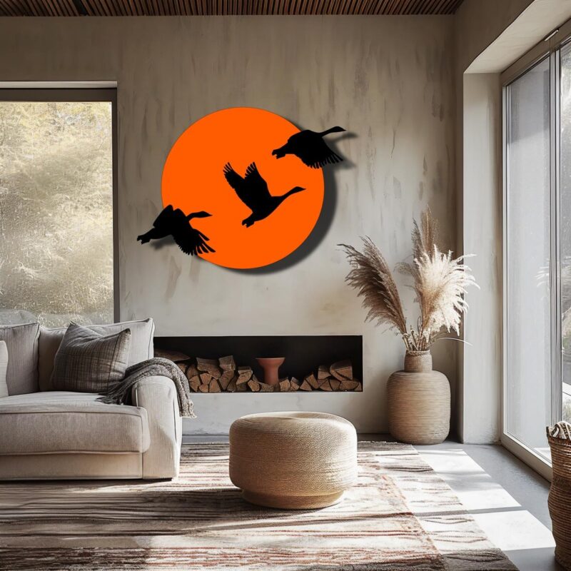این دیوارکوب از چوب سهلایه ساخته شده و دارای طراحی مینیمال و مدرنی از پرندگان مهاجر در حال پرواز در پسزمینهای از خورشید درخشان است. ترکیب رنگهای گرم و سرد، آن را برای سبکهای مختلف دکوراسیون مناسب کرده است.