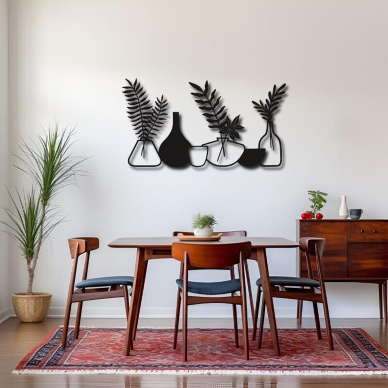 این دیوارکوب از امدیاف ساخته شده و دارای طراحی خاصی از گلدانهای مینیمال است که با خطوط ظریف و ساده ترسیم شدهاند. سبک طراحی آن بهگونهای است که فضای دیوار را بدون ایجاد شلوغی بصری، زیباتر میکند و حس آرامش طبیعت را به محیط القا میکند.