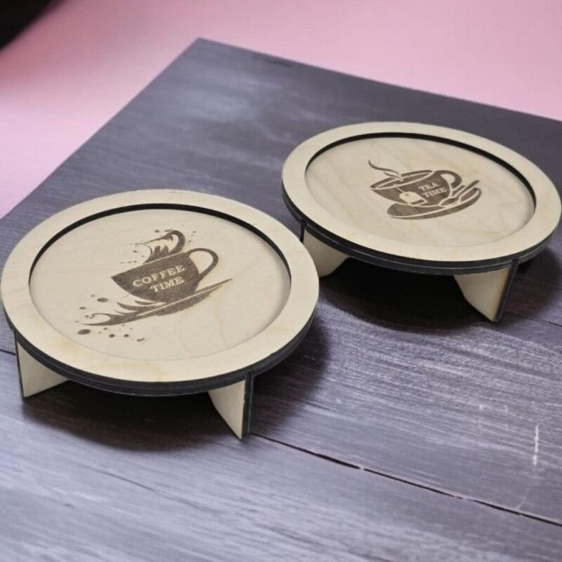 ساختهشده از چوب سهلایه با حکاکی لیزری طرح فنجان چای و قهوه. طراحی گرد با پایههای کوچک برای ایجاد فاصله از سطح و افزایش دوام.