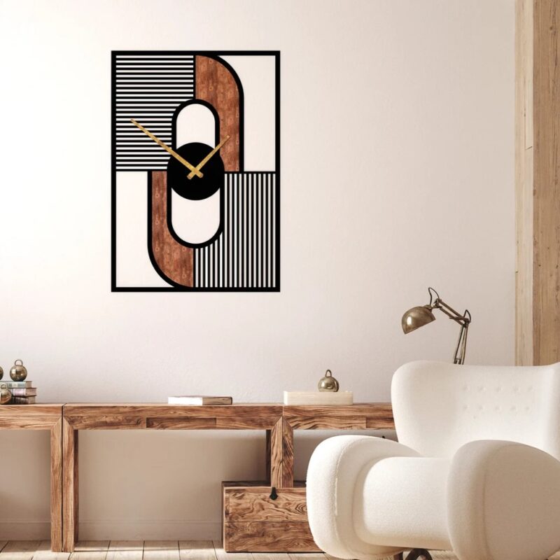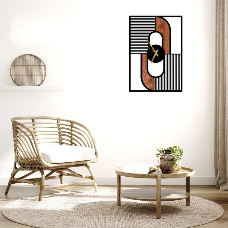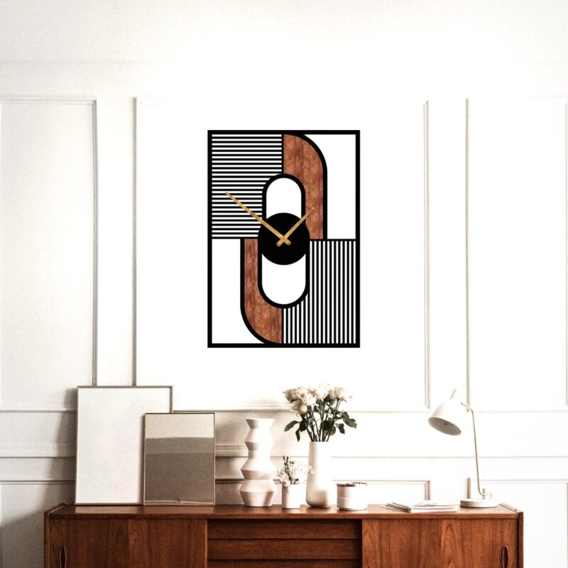 صفحه مستطیلی با ترکیب خطوط مشکی، بافت چوب و فضای منفی. مرکز ساعت دایره مشکی با عقربههای طلایی. متریال چوب سهلایه با ضخامت ۳ میلیمتر. ابعاد حدودی ۴۰ در ۶۰ سانتیمتر.