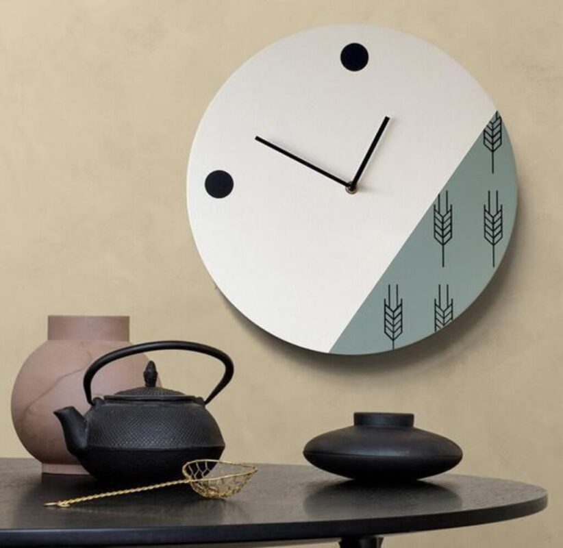 صفحهی گرد از جنس چوب سهلایه، با بخشبندی رنگی ساده و نقوش خطی ظریف روی یک قسمت آن. عقربههای مشکی براق، سادگی و خوانایی بیشتری به طراحی اضافه کردهاند.