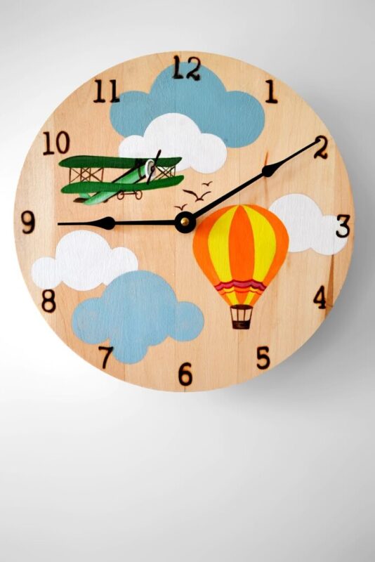 این ساعت به شکل گرد با قطر استاندارد تولید شده و طرح بالن رنگی، هواپیمای قدیمی و ابرهای کارتونی با چاپ فلتبد روی چوب سه لایه اجرا شدهاند. اعداد به صورت مشکی و برجسته حک شدهاند و ترکیب رنگها بسیار هماهنگ و کودکپسند است. وزن سبک و قابلیت نصب آسان از ویژگیهای مهم این محصول است.