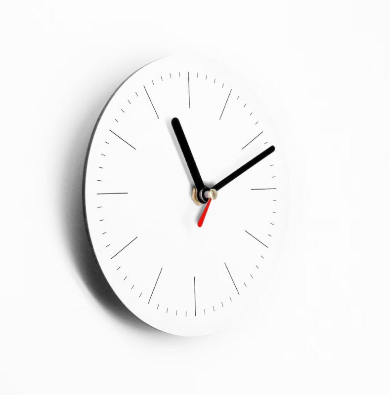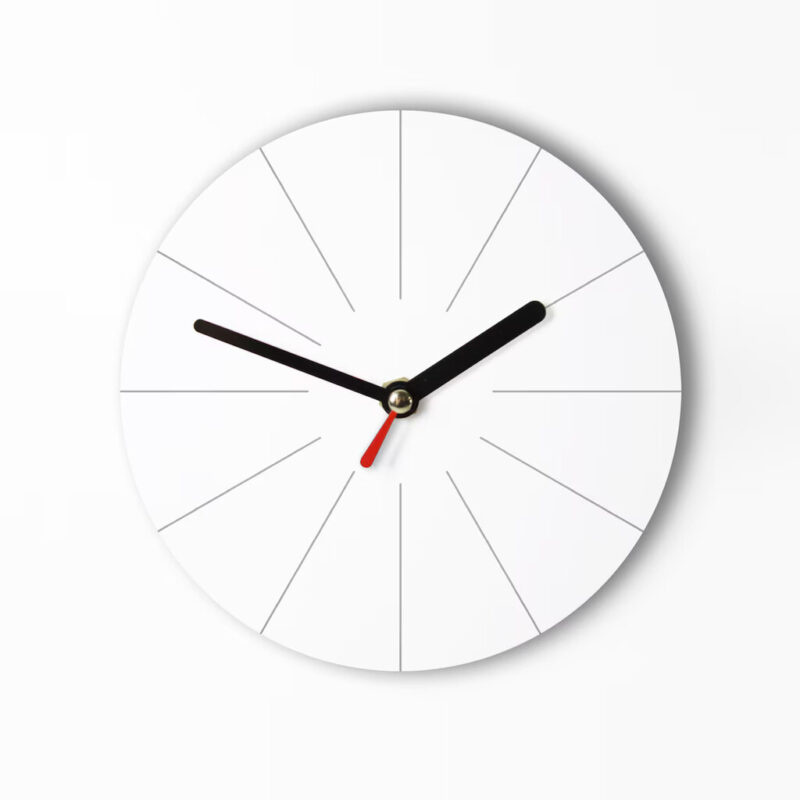 ساعت دارای صفحهای دایرهای به رنگ سفید مات است که از MDF سهلایه ۳ میلیمتر ساخته شده. نشانگرها بهصورت خطوط نازک و دقیق طراحی شدهاند و عقربهها به رنگ مشکی و قرمز هستند. طراحی کاملاً ساده، بدون اعداد و بدون تزئینات اضافه، مناسب فضاهای مدرن.