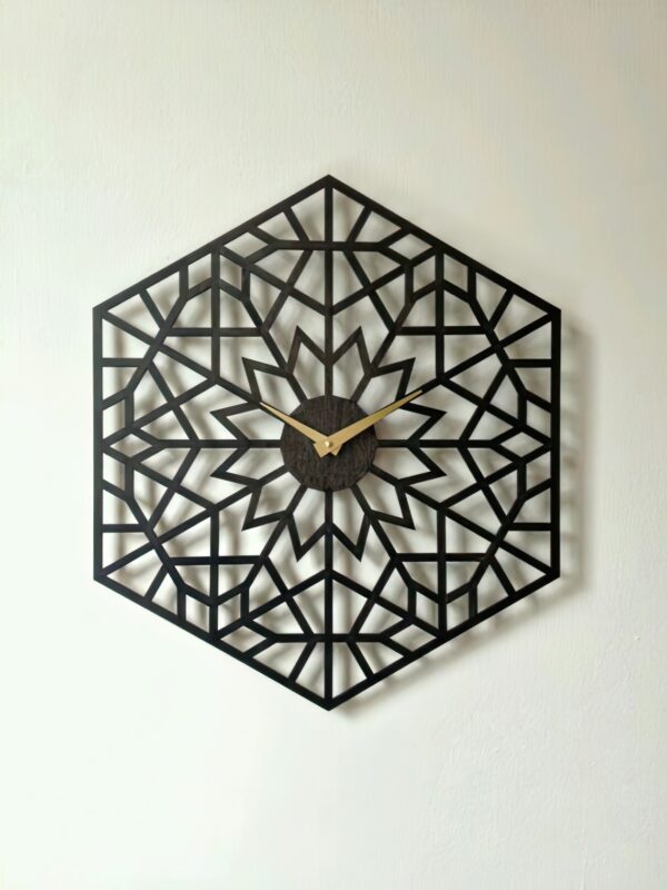 این ساعت دیواری دارای قاب ششضلعی با طرحی هندسی و الهام گرفته از الگوهای اسلیمی است. جنس آن از چوب سهلایه مستحکم بوده و ضخامت ۳ میلیمتری آن باعث شده که هم سبک و هم بادوام باشد. عقربههای طلایی، جلوهای زیبا و چشمنواز به آن بخشیده است. ⌛