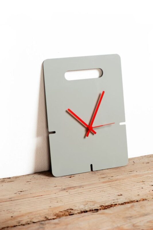 ساعت مستطیلی از جنس چوب سهلایه با طراحی ساده و مینیمال، عقربههای قرمز و حفرهی دستگیرهای در بالا که هم کاربردی است و هم جنبهی تزئینی دارد.