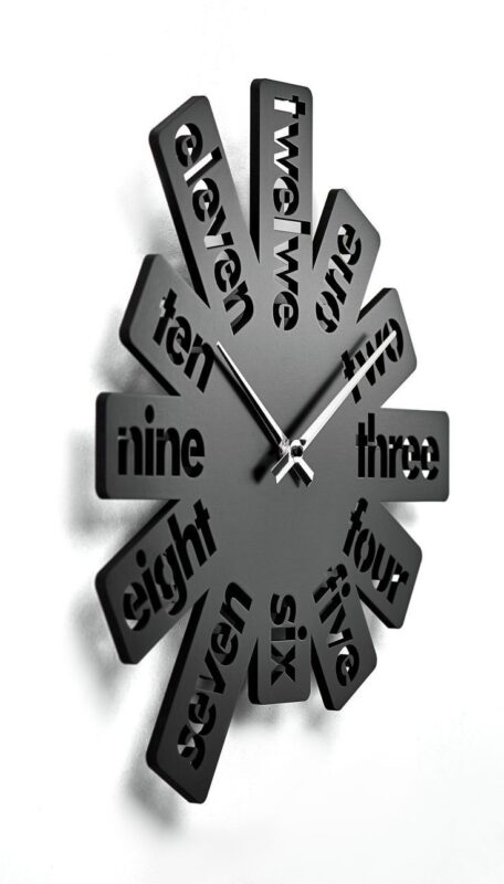 بدنه ساعت از پلکسی مشکی ۳ میلیمتری ساخته شده و بهصورت شعاعی طراحی شده که نام تمام اعداد (one، two، three و…) بهصورت برجسته روی آن برش خورده است. ترکیب با عقربههای فلزی براق جلوهای خاص ایجاد کرده است.