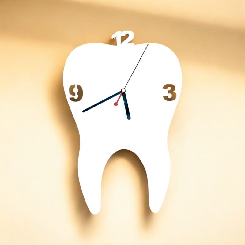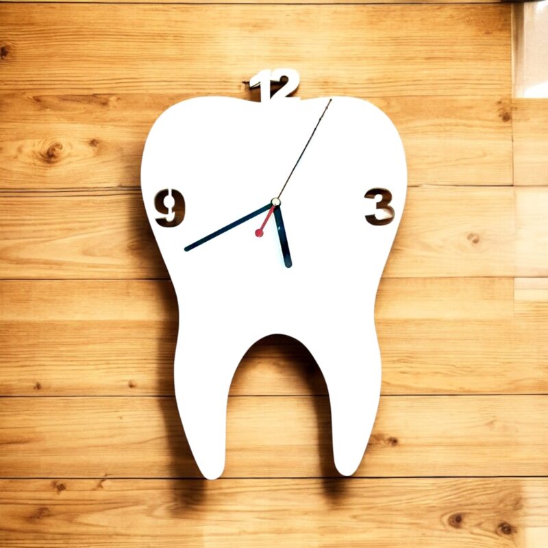 طرح ساعت به شکل دندان بوده که به طور مستقیم با حوزه دندانپزشکی مرتبط است و به همین دلیل، گزینهای ایدهآل برای تزیین و تبلیغات در کلینیکهای دندانپزشکی به شمار میرود. رنگ پسزمینه سفید، ظاهری شیک و مدرن به ساعت بخشیده و به راحتی با دکوراسیون داخلی کلینیک شما هماهنگ میشود.