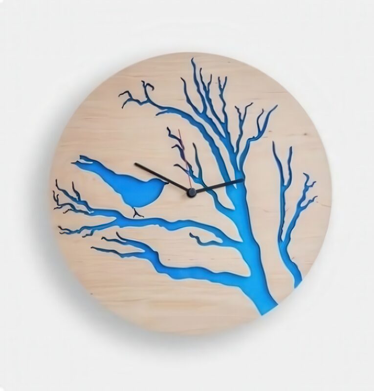 ساعت به صورت دایرهای از چوب سه لایه ساخته شده و طراحی شاخههای درخت و پرنده با برش لیزری اجرا شده است. قسمت شاخه و پرنده به رنگ آبی دستی رنگآمیزی شده و صفحه ساعت بافت طبیعی چوب را دارد. عقربههای ساده و ظریف، ترکیب مدرن و کلاسیک را کامل میکند.