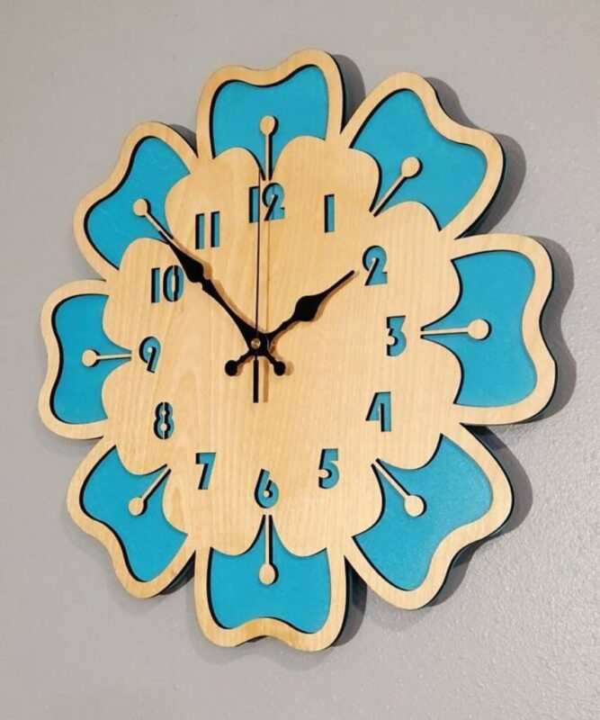 ساختهشده از امدیاف مقاوم، رنگآمیزی ترکیبی چوب طبیعی و آبی، طراحی گلبرگهای متقارن، عقربههای مشکی براق و موتور بیصدا.