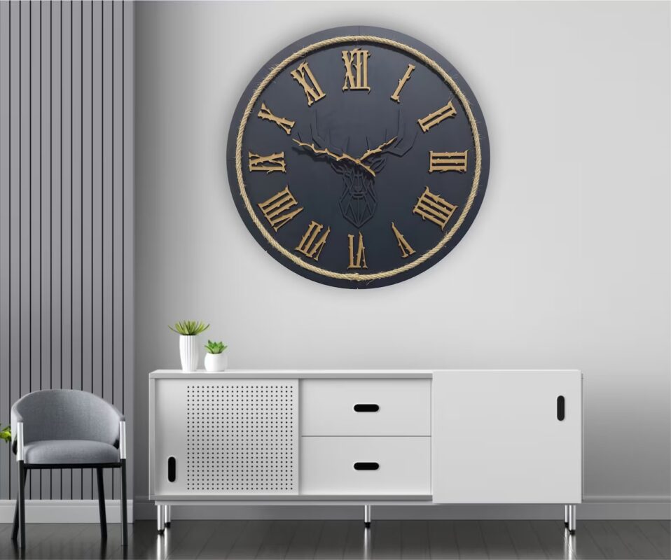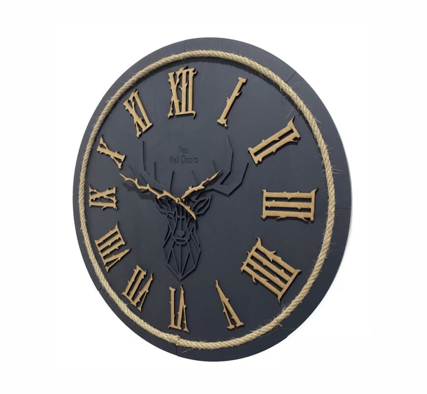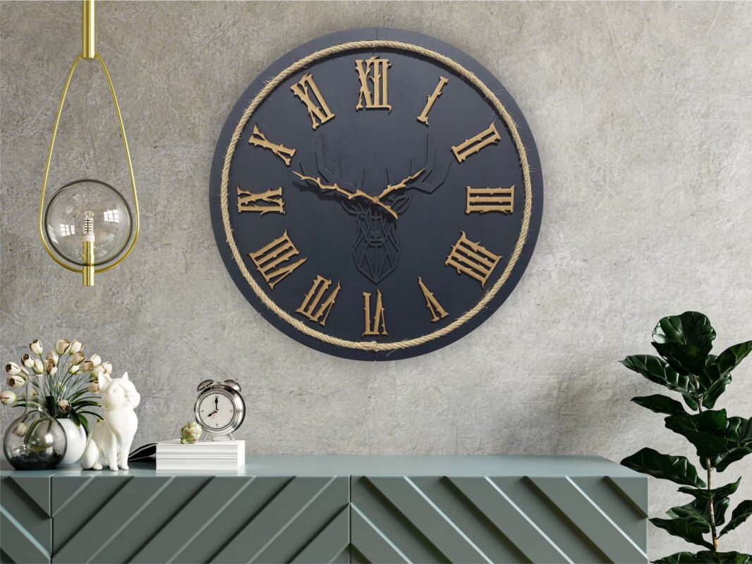 🖤 رنگ پسزمینه مشکی: رنگ مشکی زمینه ساعت، باعث برجستهتر شدن طرح گوزن در وسط ساعت میشود و به اوج زیبایی و شگفتی این اثر هنری میافزاید.