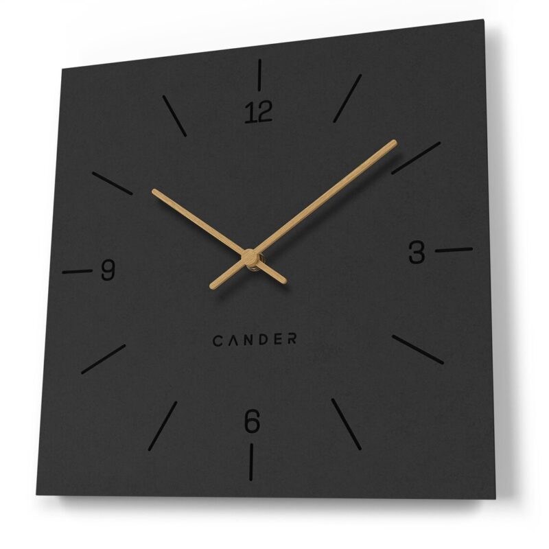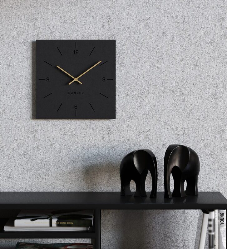 صفحه مربعی از چوب سهلایه با ضخامت ۳ میلیمتر، رنگ مشکی مات، اعداد ۳، ۶، ۹ و ۱۲ با فونت مینیمال. عقربههای طلایی ساده و ظریف، ابعاد حدودی ۳۰×۳۰ سانتیمتر.
